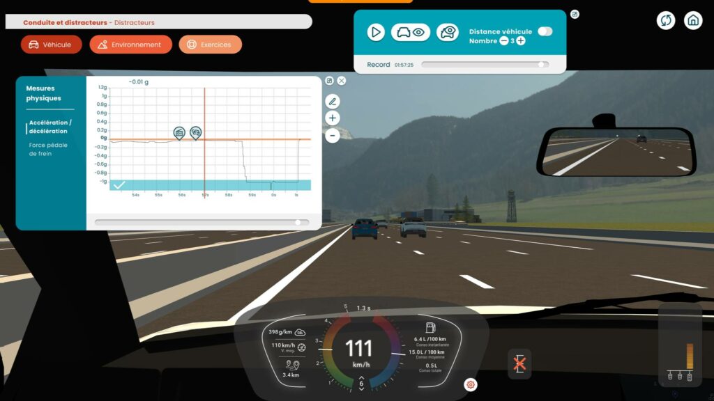 Grâce à l’addition d’un module distracteurs, il est désormais possible de mesurer la perte d’attention liée à l’utilisation de la radio, du téléphone ou d’un accessoire. Les bilans détaillés permettent de quantifier précisément l’impact de ces perturbations sur la conduite.